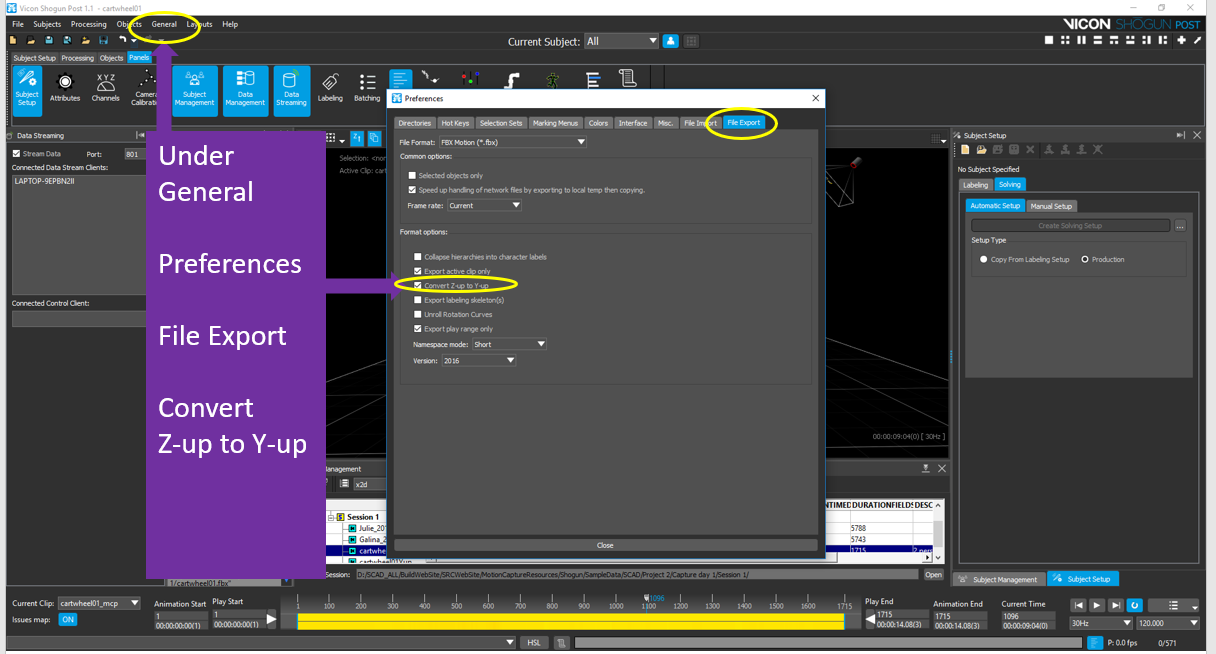 Since we are now using z-up but in Houdini/Maya z is out, you will need to set your preferences for your export to fbx - there is not a dropdown or right-click option but you can find the option under General/Preferences/File Export tab in Shogun Post