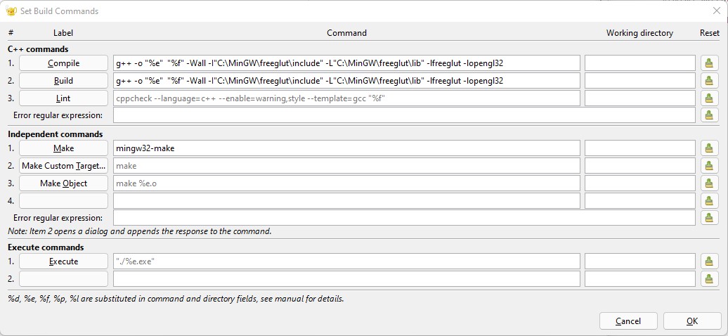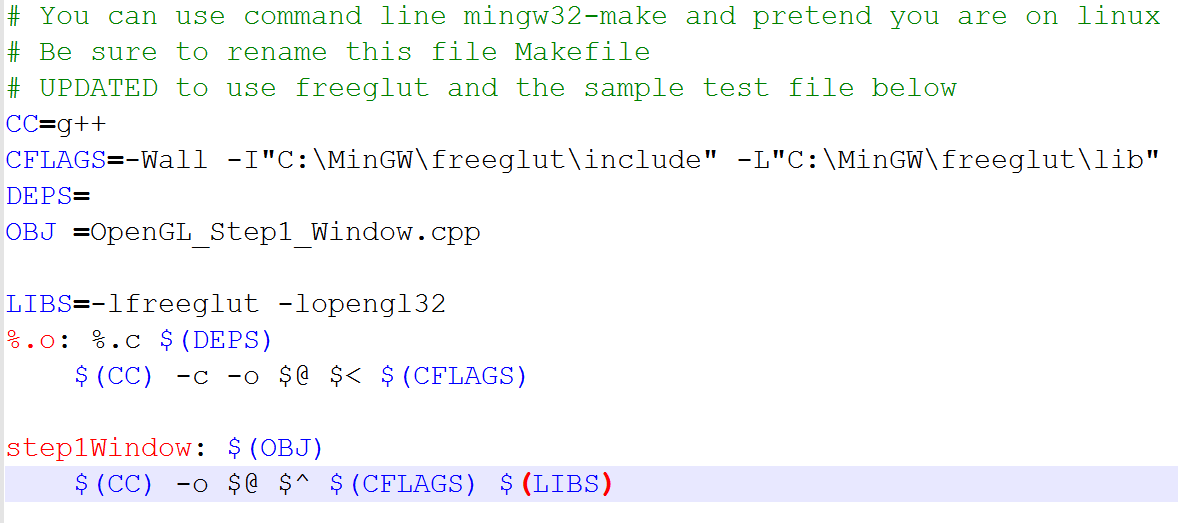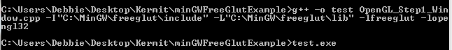 ie. g++ -o test OpenGL_Step1_Window.cpp -I"C:\MinGW\freeglut\include" -L"C:\MinGW\freeglut\lib" -lfreeglut -lopengl32