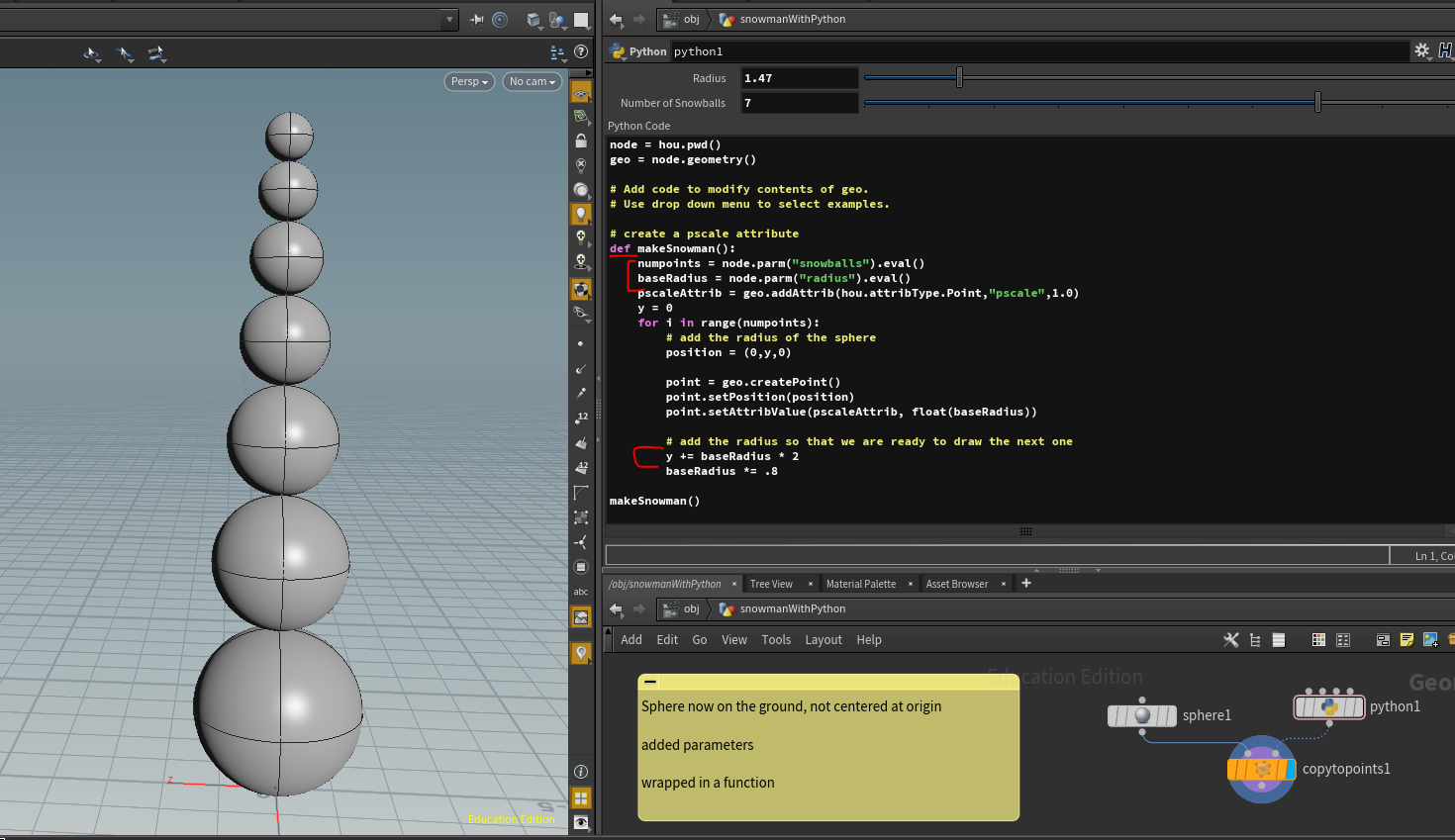 Finally, user defined parameters are added so that we have a tool we could use to allow arbitrary amounts of snowballs and adjustable radius.
