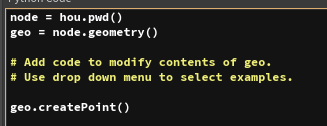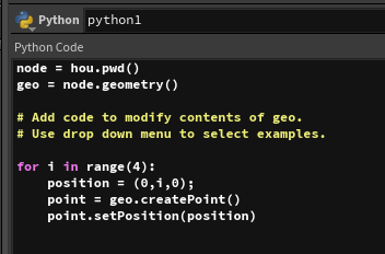 - Create a geo node, dive inside (double click) and create a python node. (To create nodes use the tab menu)