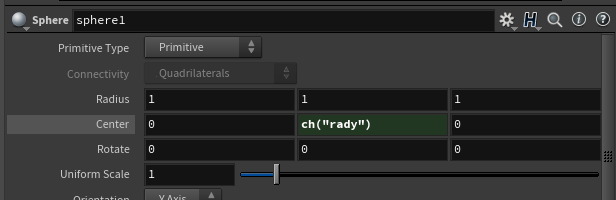 In this way, no matter what the size of the sphere, it will sit on the groundplane. So the expression in ty (Center's parameter) is set to ch("rady") which is the value of the radius in the y direction
