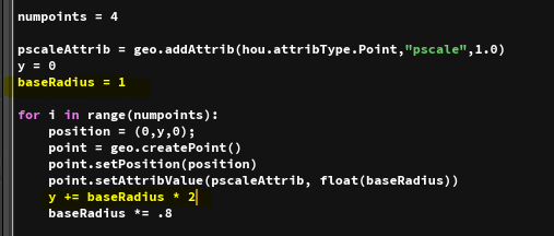 Next add the line to manipulate the radius, baseRadius *= .8 and you have the code given below