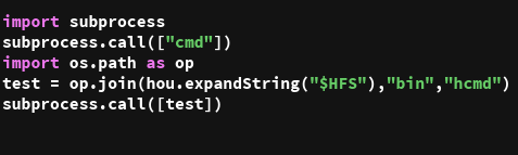 A less frequently used case would be to execute external commands from inside Houdini python scripts. I have created an example which uses both Windows command cmd as well as hcmd from Houdini's bin to demonstrate the syntax. I have then put it into a "Make your own" format as described above.