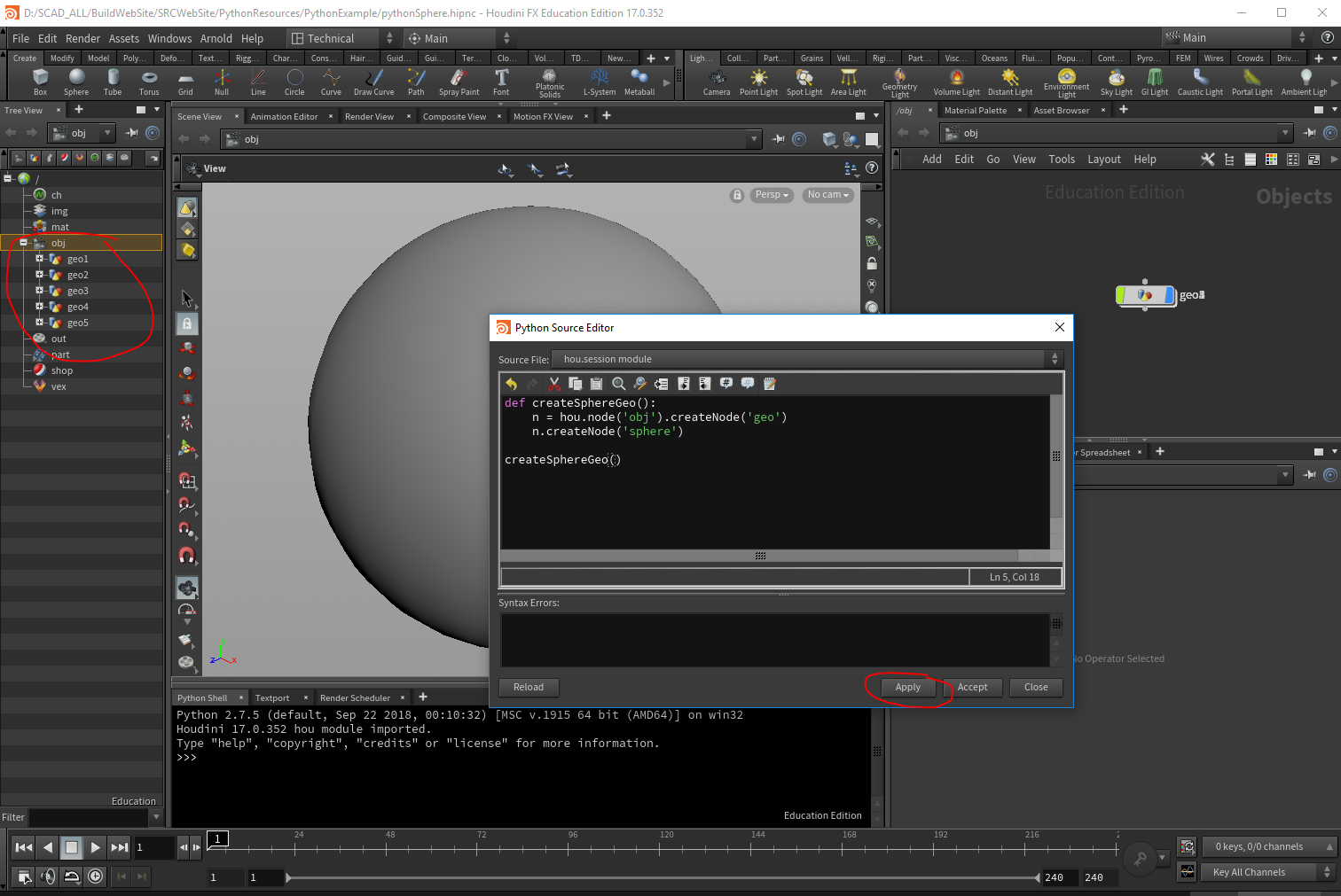So for example, to create a sphere in the python source editor you
