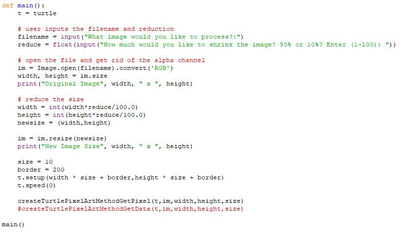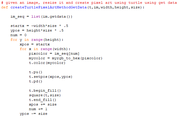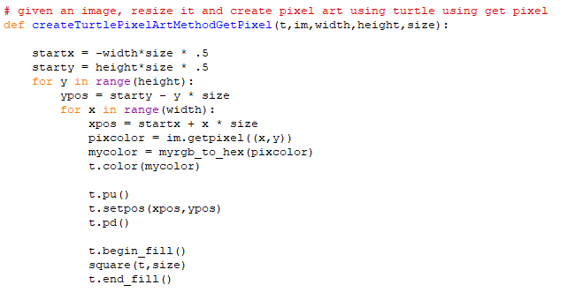 I am using PIL in the following example to create Pixel Art in turtle graphics out of any image. I created this due to a discussion after class one day about automating the process of making pixel art which has regained popularity recently. A few students each quarter have made pixel art in turtle, but this is the first time anyone asked how it could be automated so I thought I'd create an example.